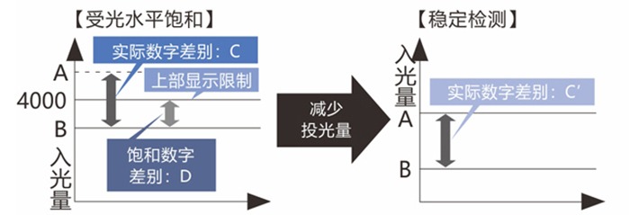 When the light level reaches saturation during close-range detection, transparent objects, or small objects, the sensor’s light output can be reduced to achieve stable detection.