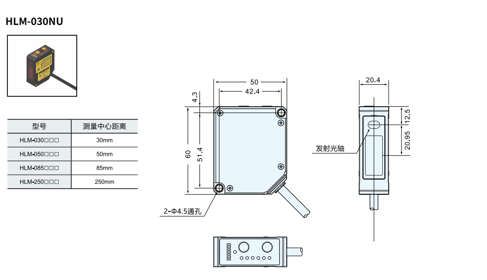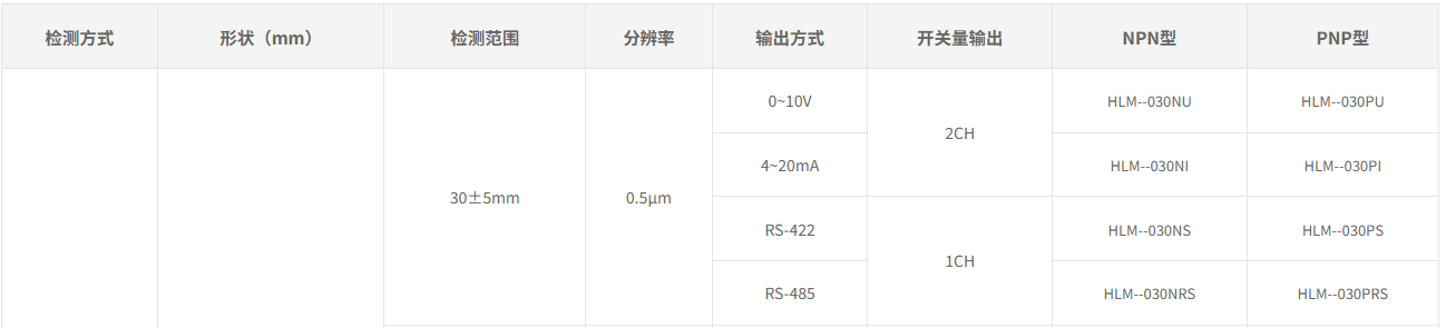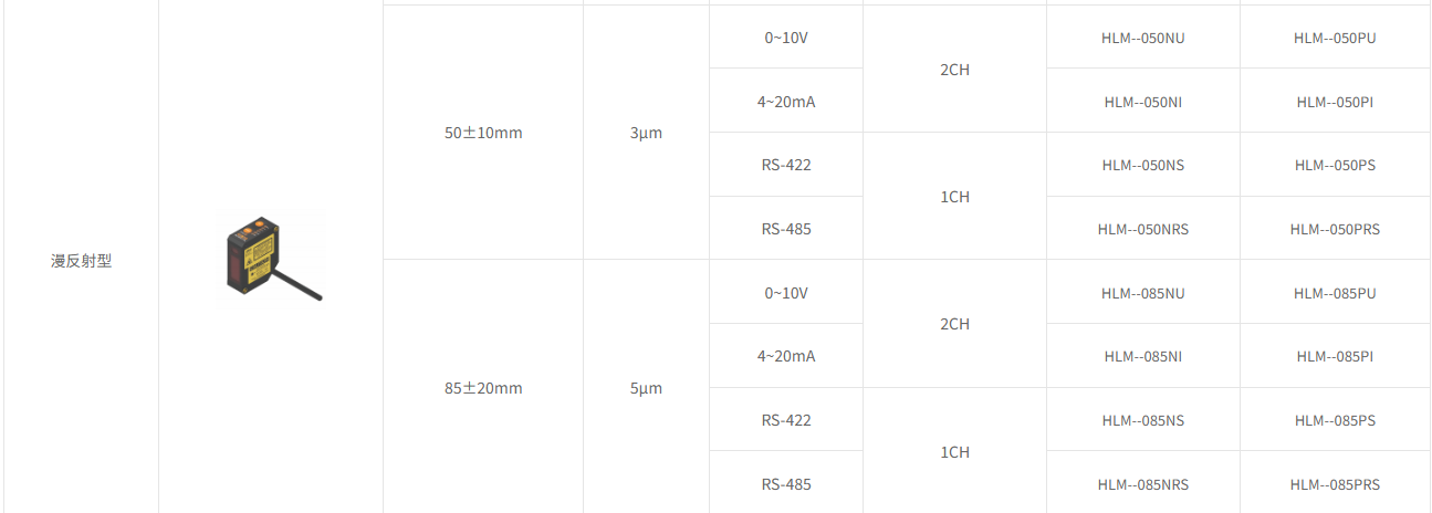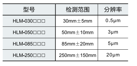 A variety of models are available with detection ranges of 30 ± 5mm, 50 ± 10mm, 85 ± 20mm, and 250 ± 150mm.
