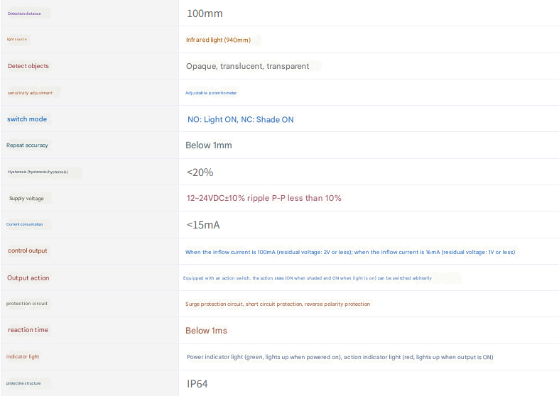 Adjustable sensing distance and switchable operating state (light-on, light-off) can meet diverse customer needs. The product offers stable performance, strong adaptability, and high repeatability. It features a small hysteresis distance and fast response speed, and is equipped with surge protection, short-circuit protection, and reverse polarity protection.